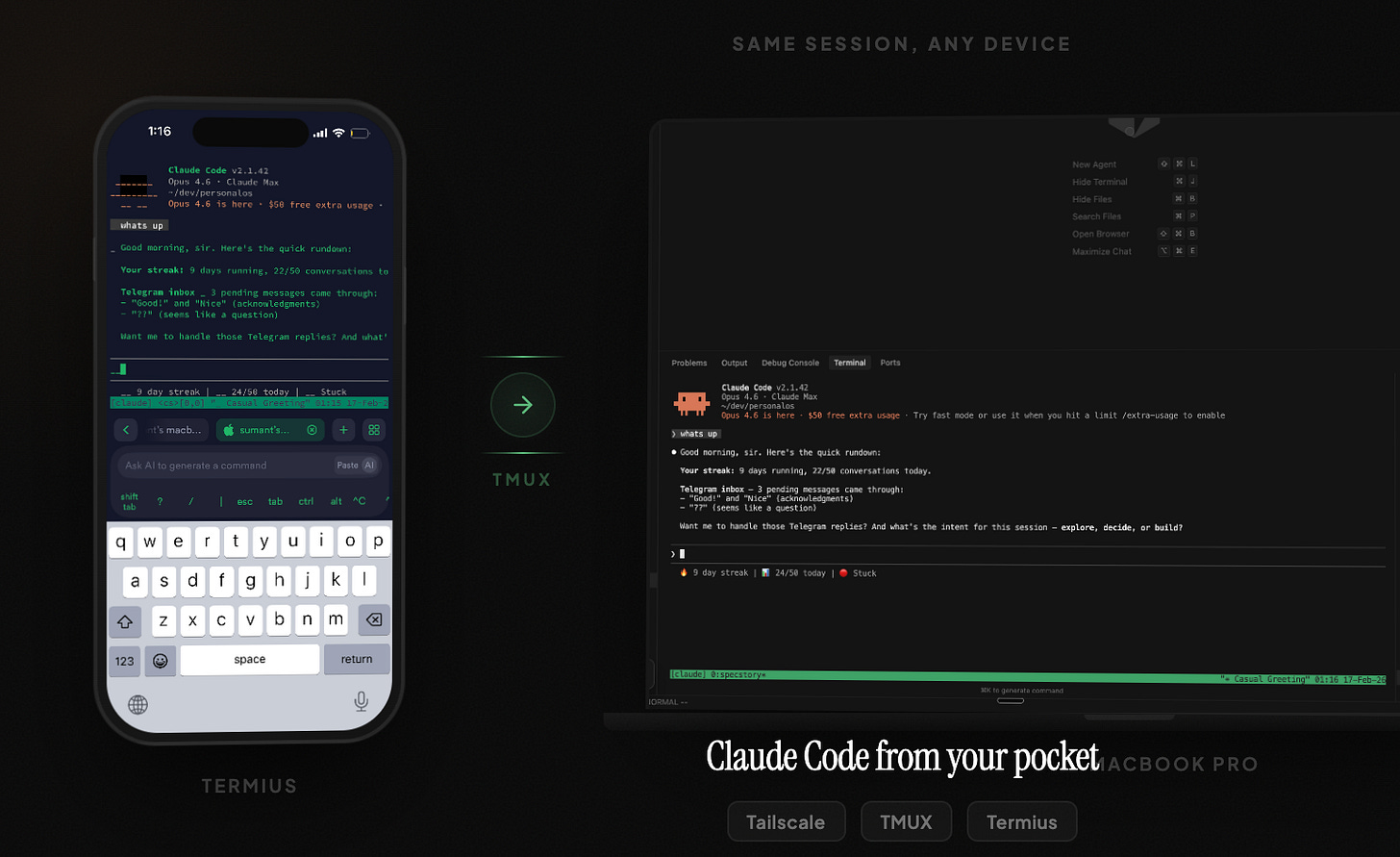 Run tmux attach -t claude from both your phone and your Mac’s Terminal. Both screens mirror each other in real time. Type a prompt on your phone from the couch, watch it run on your laptop. Both devices, same session, live.